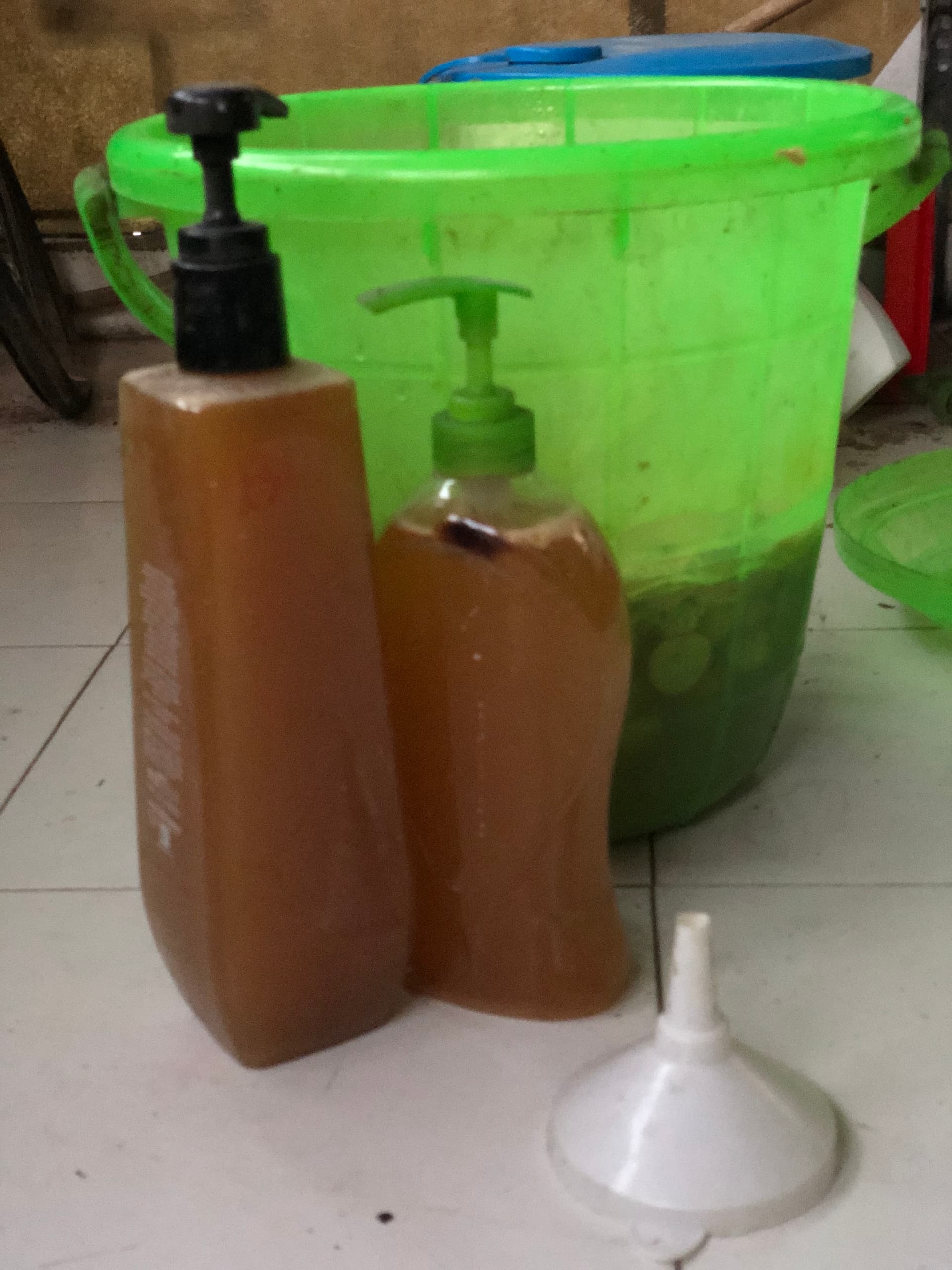 - After the bio enzyme is ready strain the liquid into bottles and it is ready to use!! (the peels go into your wet-waste bin or compost)